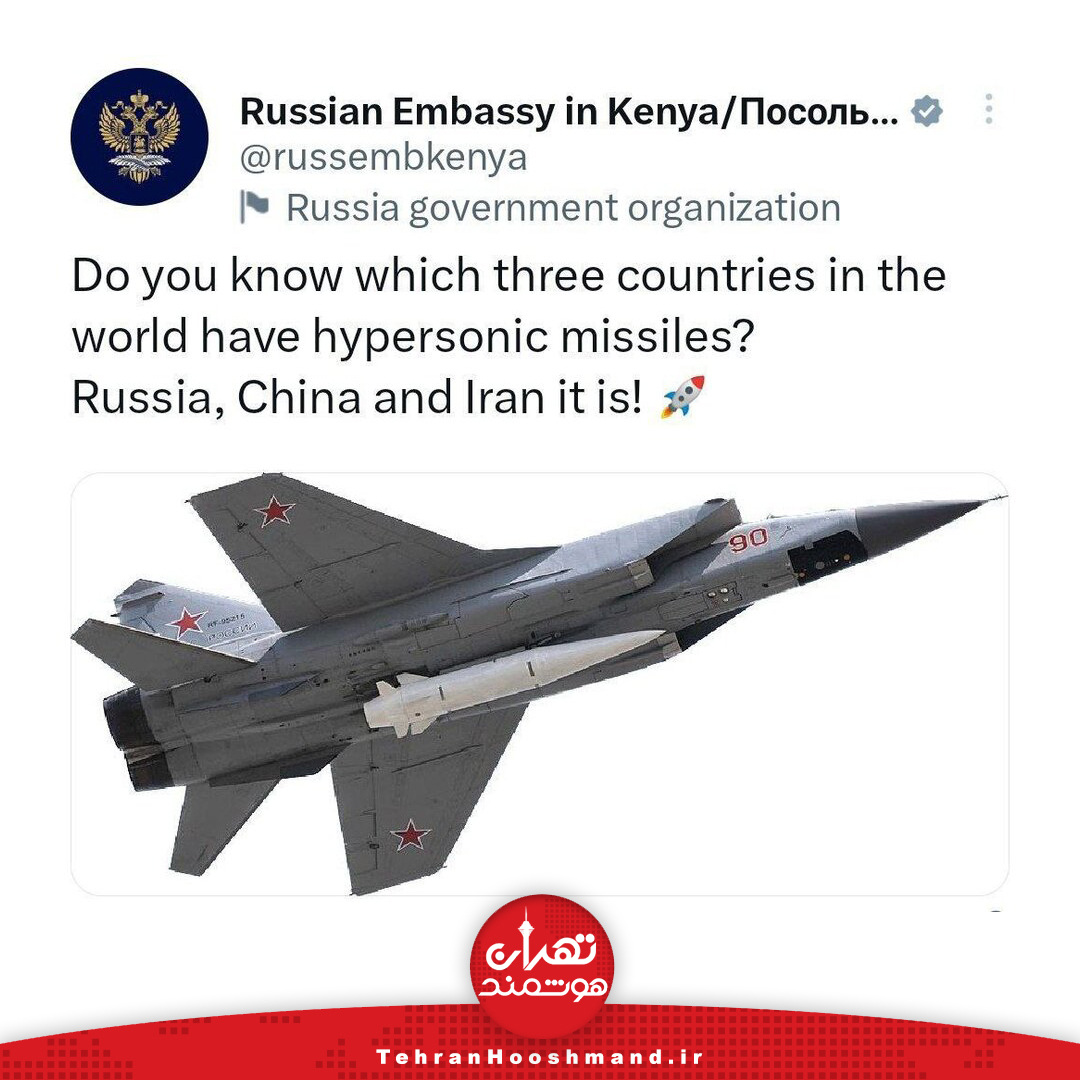 توییتر رسمی سفارت روسیه در تهران نوشت:آیا میدانید سه کشور جهان دارای موشکهای مافوق صوت هستند؟روسیه، چین و ایران