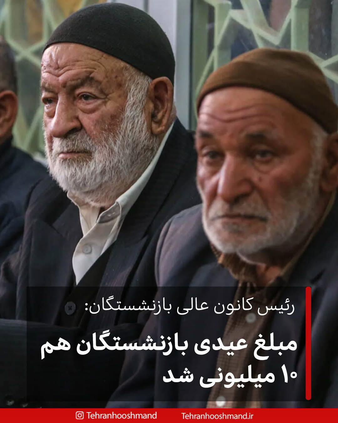 رئیس کانون عالی بازنشستگان: مبلغ عیدی بازنشستگان تأمین اجتماعی همسطح عیدی کارکنان دولت تعیین شده و به ۱۰ میلیون تومان خواهد رسید.